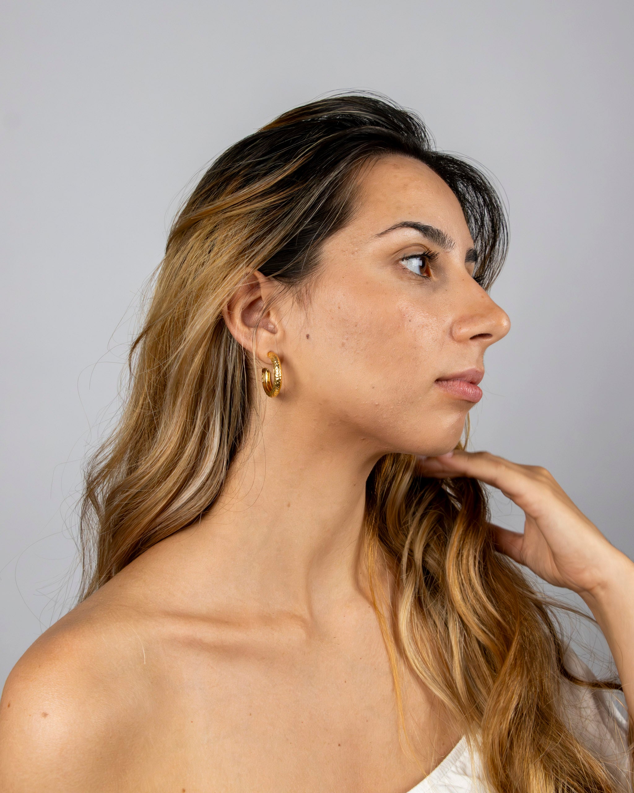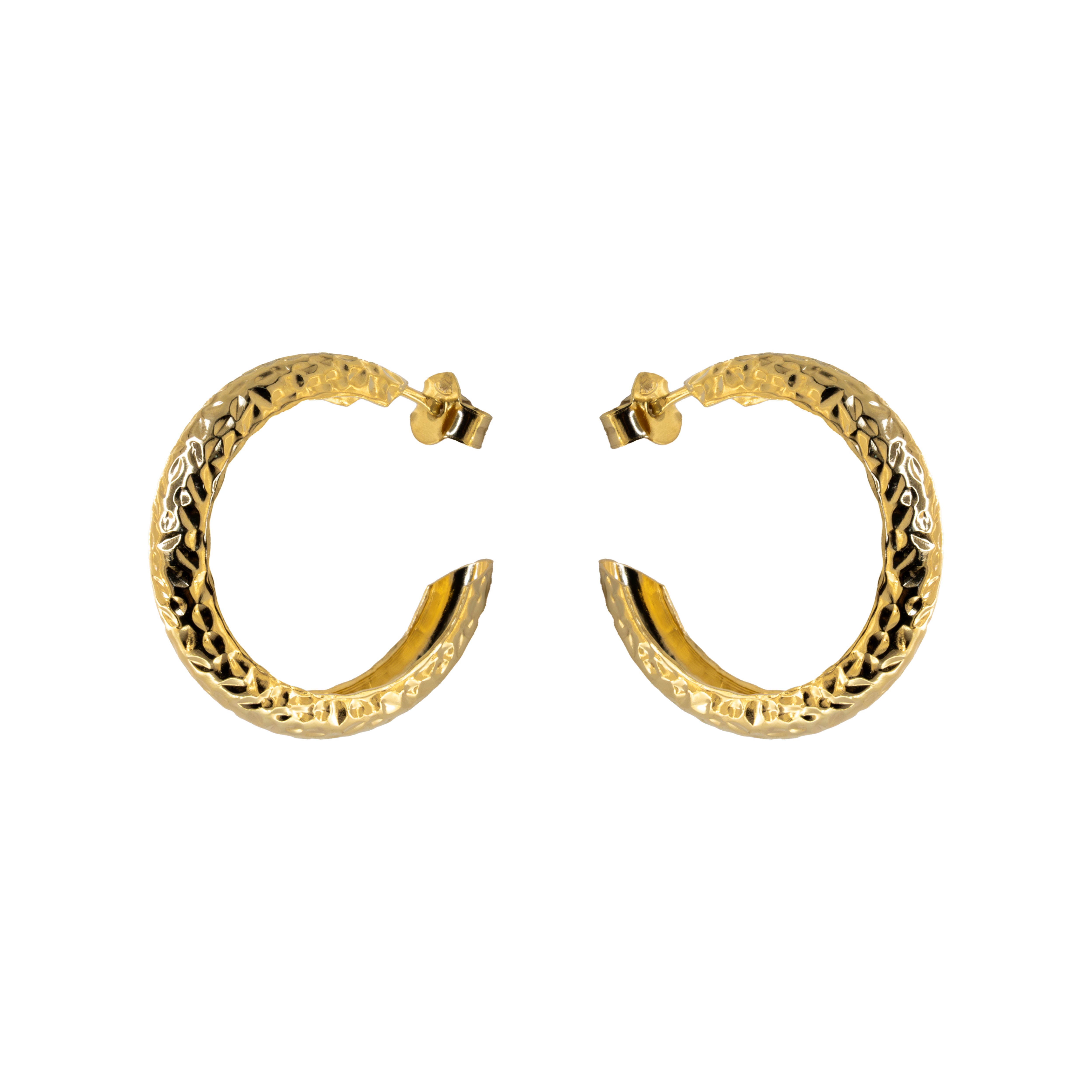 Celebra a arte ancestral com os Brincos Penélope, onde argolas douradas exibem uma textura trabalhada que captura a luz através de padrões intrincados. Esta peça sofisticada homenageia o artesanato tradicional numa linguagem contemporânea, criando um acessório que equilibra riqueza visual com elegância dourada atemporal