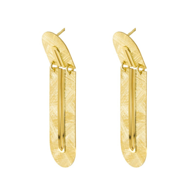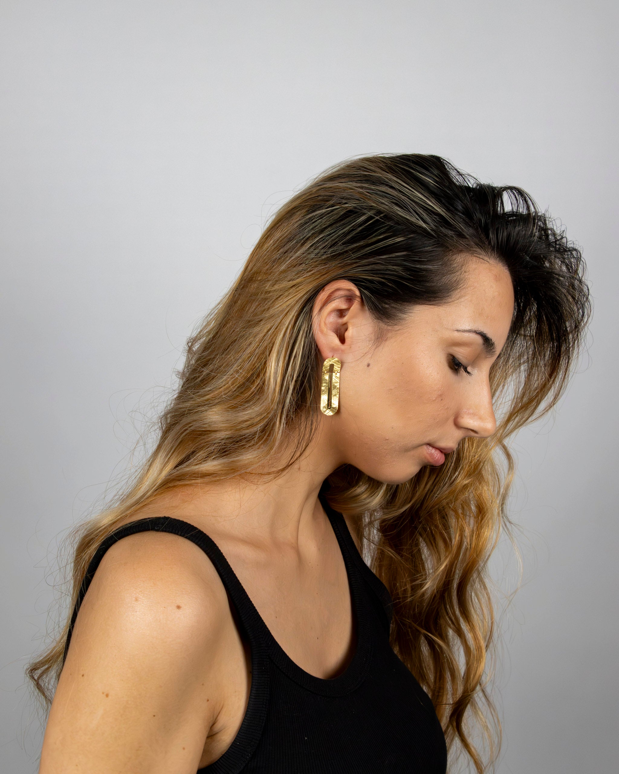 Destaca-te com os Brincos Teia, onde formas ovais texturizadas abraçam uma barra dourada polida numa composição arquitectónica sofisticada. Esta peça contemporânea equilibra volume e linearidade, criando um contraste visual fascinante que alonga graciosamente a silhueta e adiciona um toque de modernidade urbana ao teu look