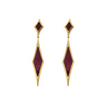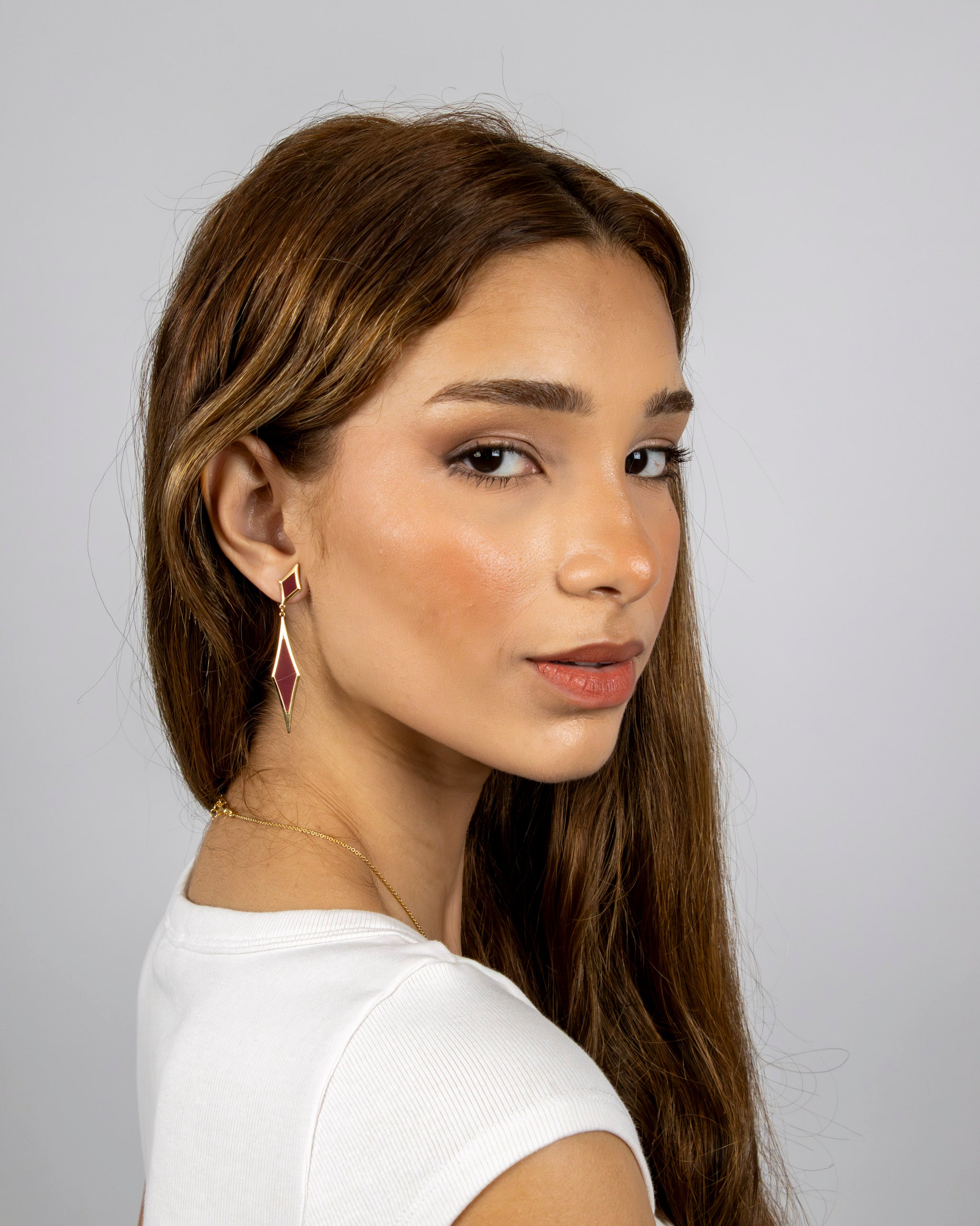 Comanda atenção com os Brincos Juno, onde formas losangulares douradas abraçam elementos vermelhos profundos numa cascata vertical dramática. Esta peça equilibra geometria angular com intensidade cromática, criando um acessório que irradia confiança e sofisticação através da sua presença magnética e design arquitetónico