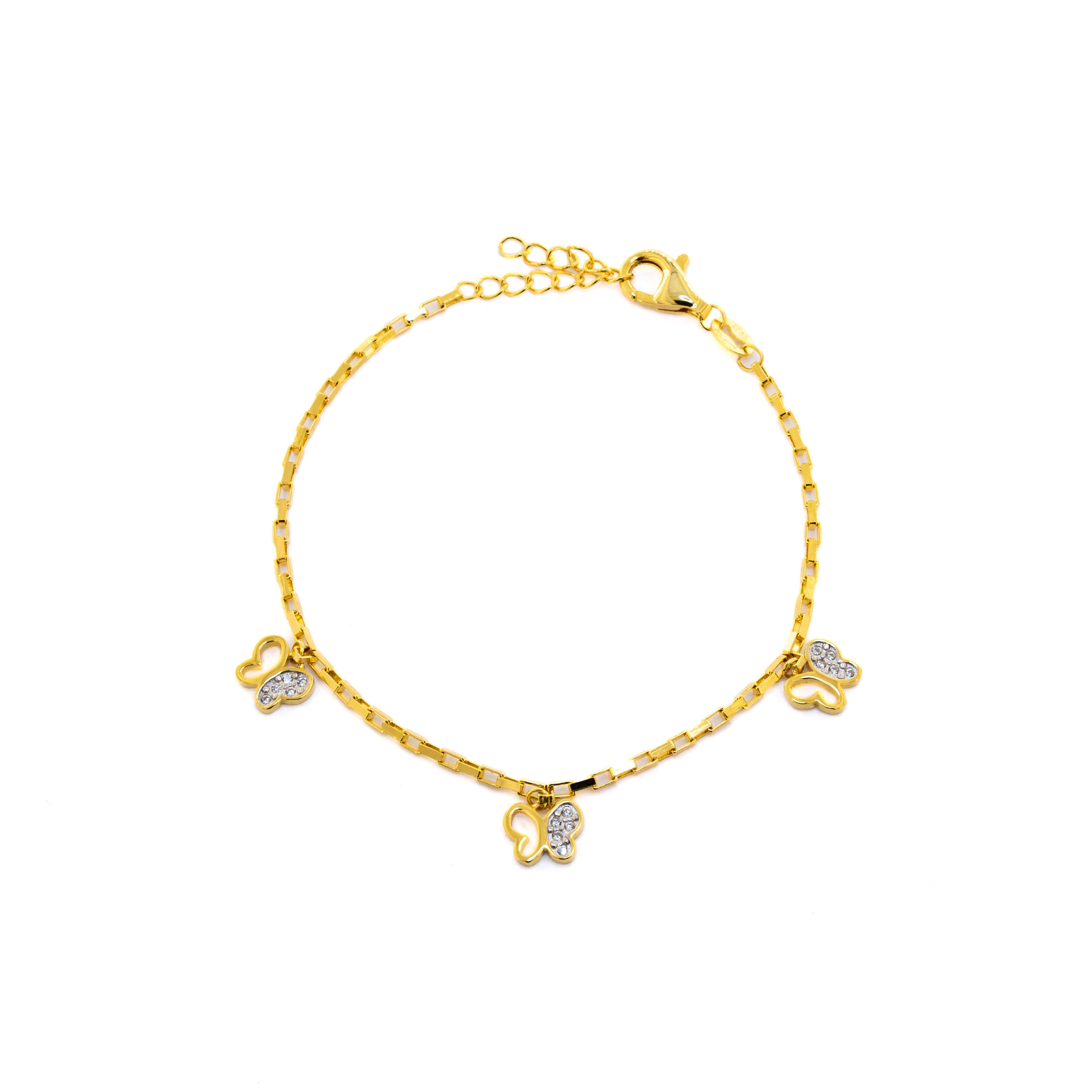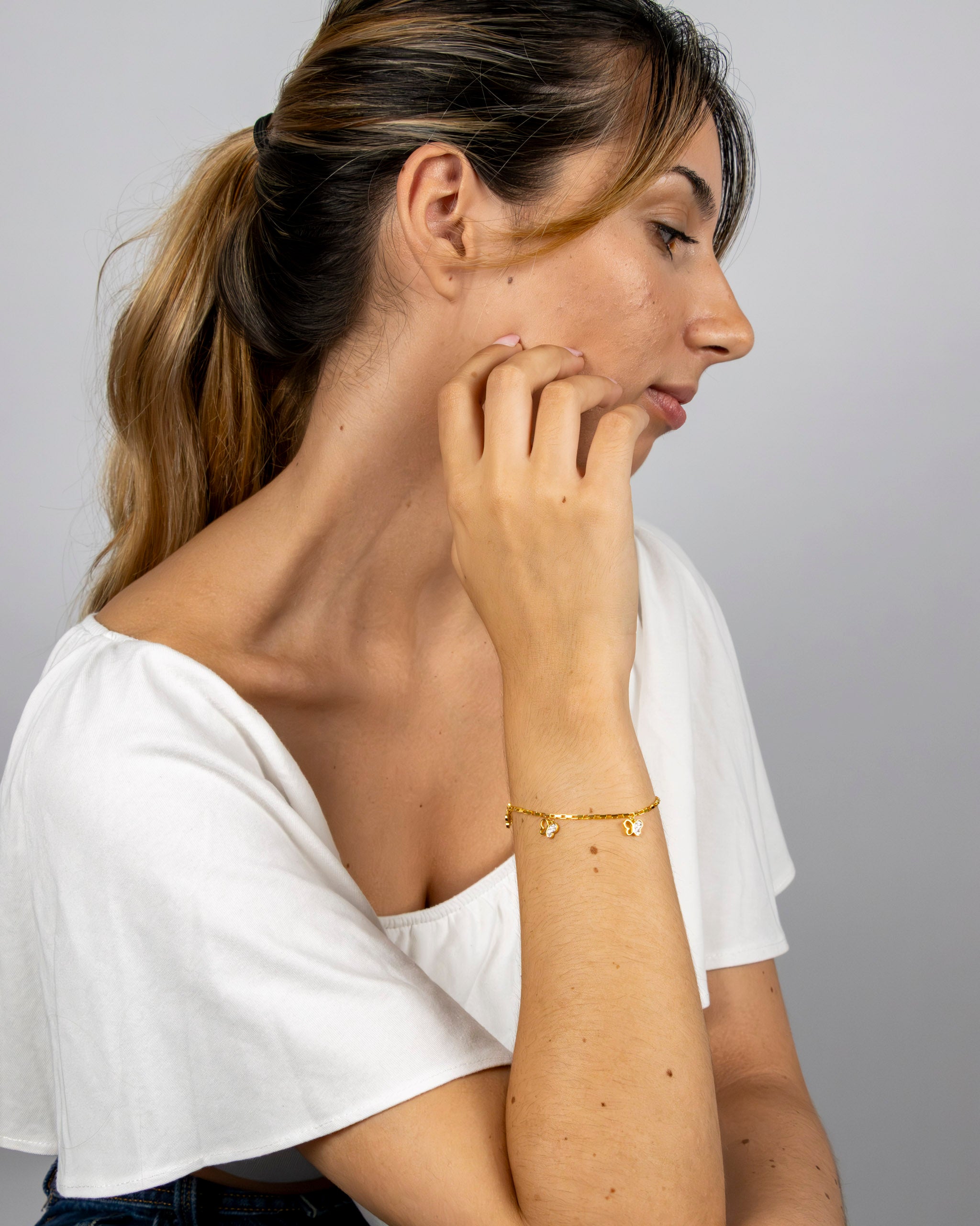 Voa em direção à transformação com a Pulseira Eco, onde três borboletas douradas cravejadas de cristais pousam delicadamente numa corrente geométrica. Esta peça poética celebra a metamorfose pessoal e a leveza do ser, criando um acessório que sussurra liberdade através dos seus detalhes alados e luminosos