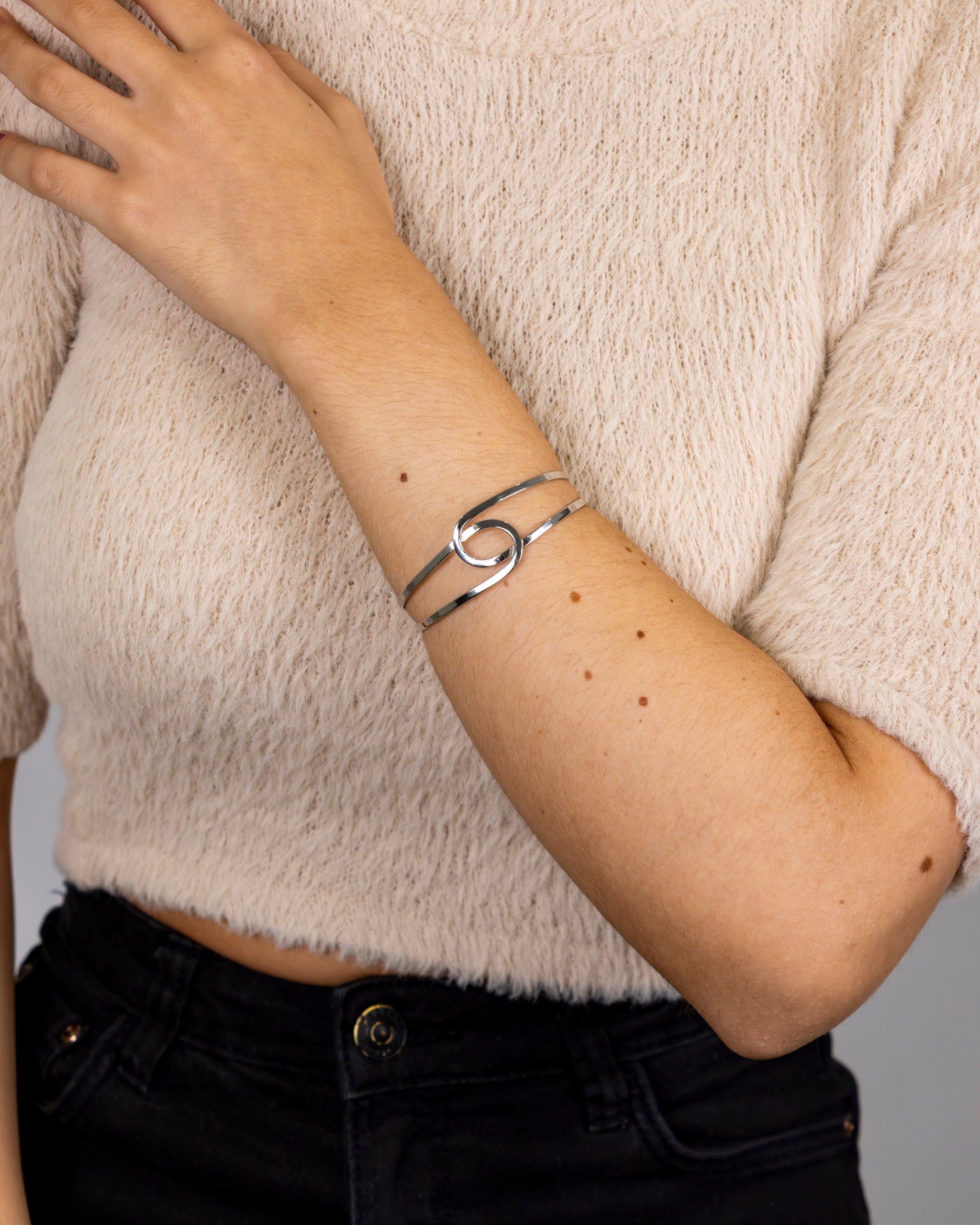 Two silver lines intertwined by a circle. Quiet sophistication on the wrist