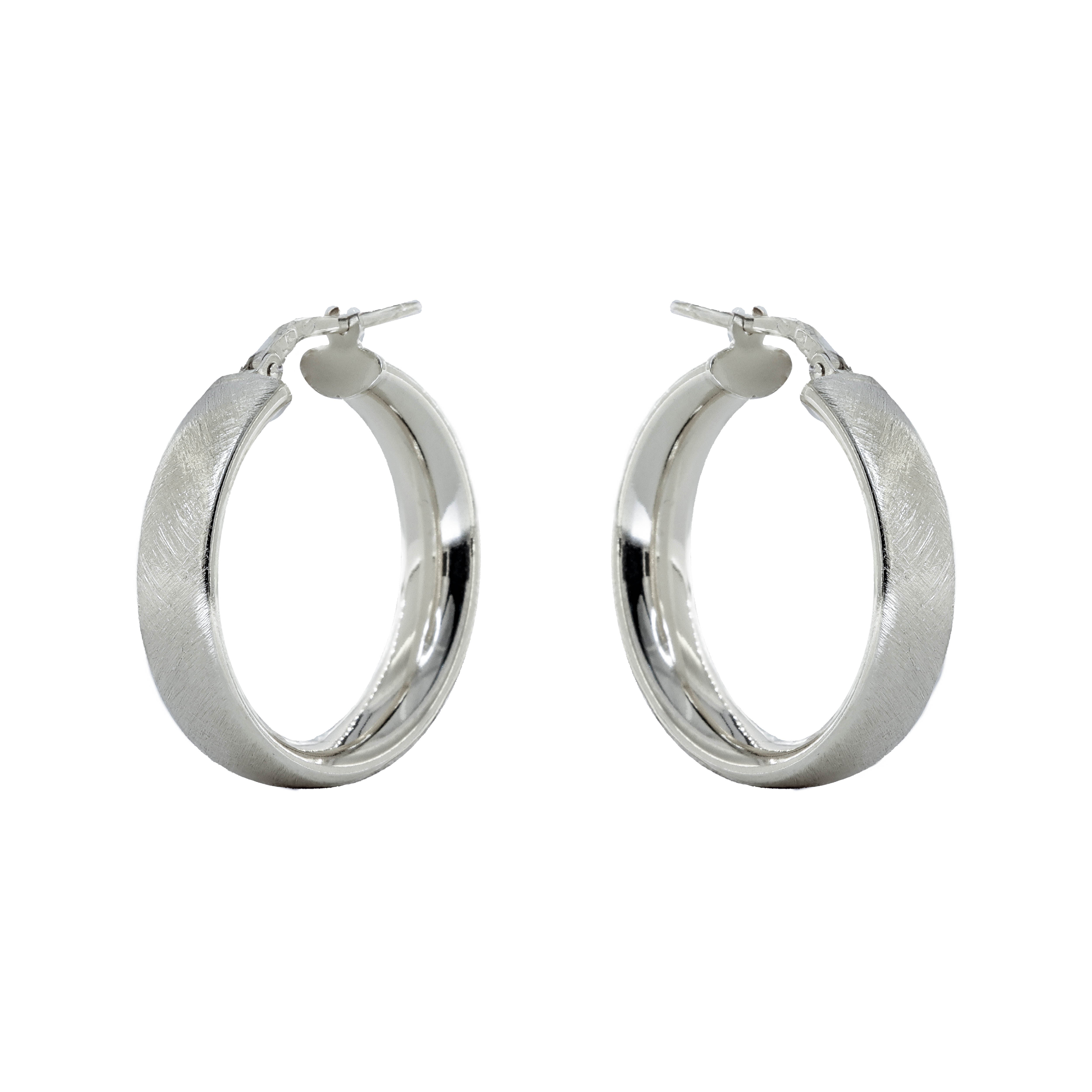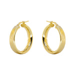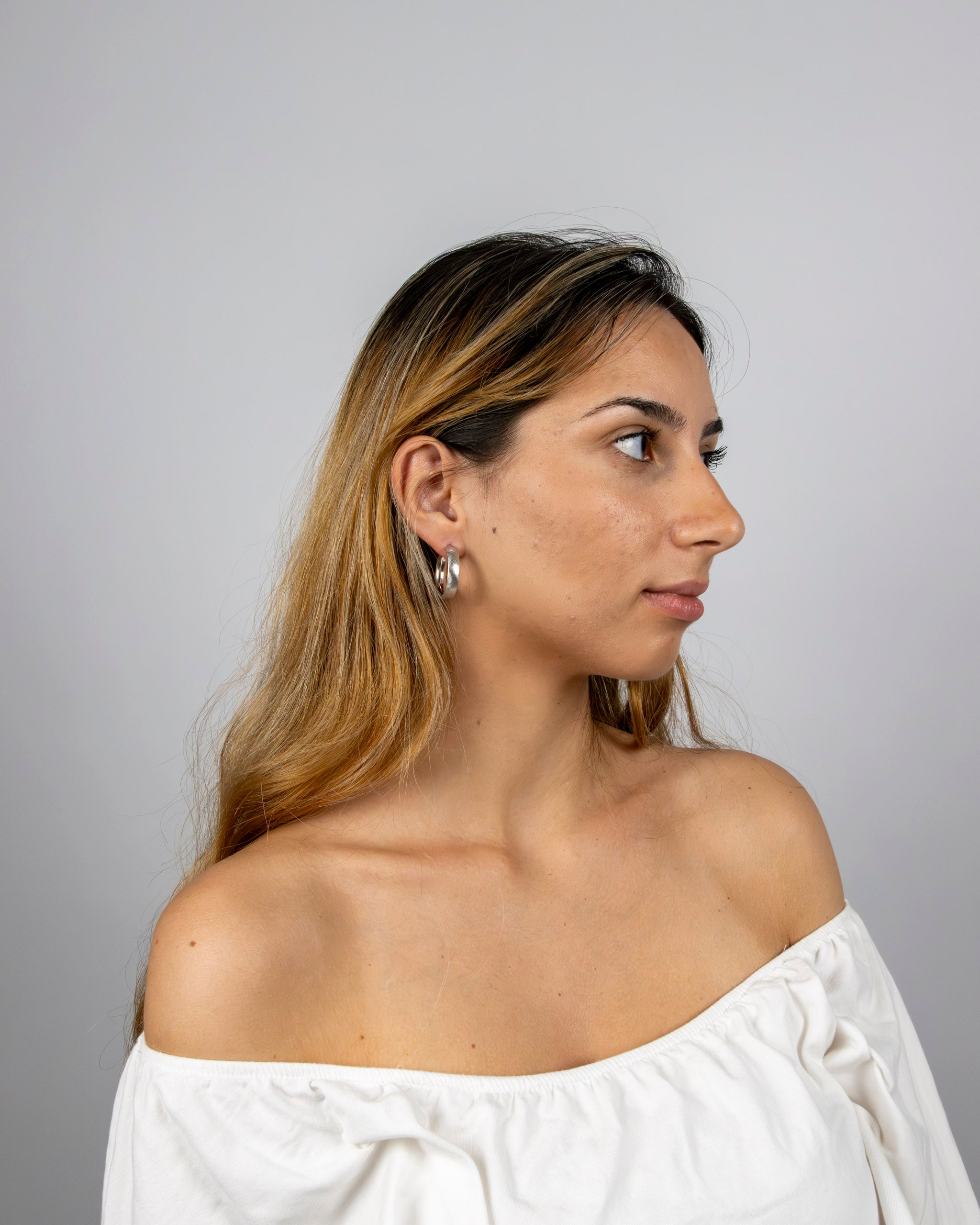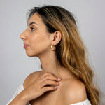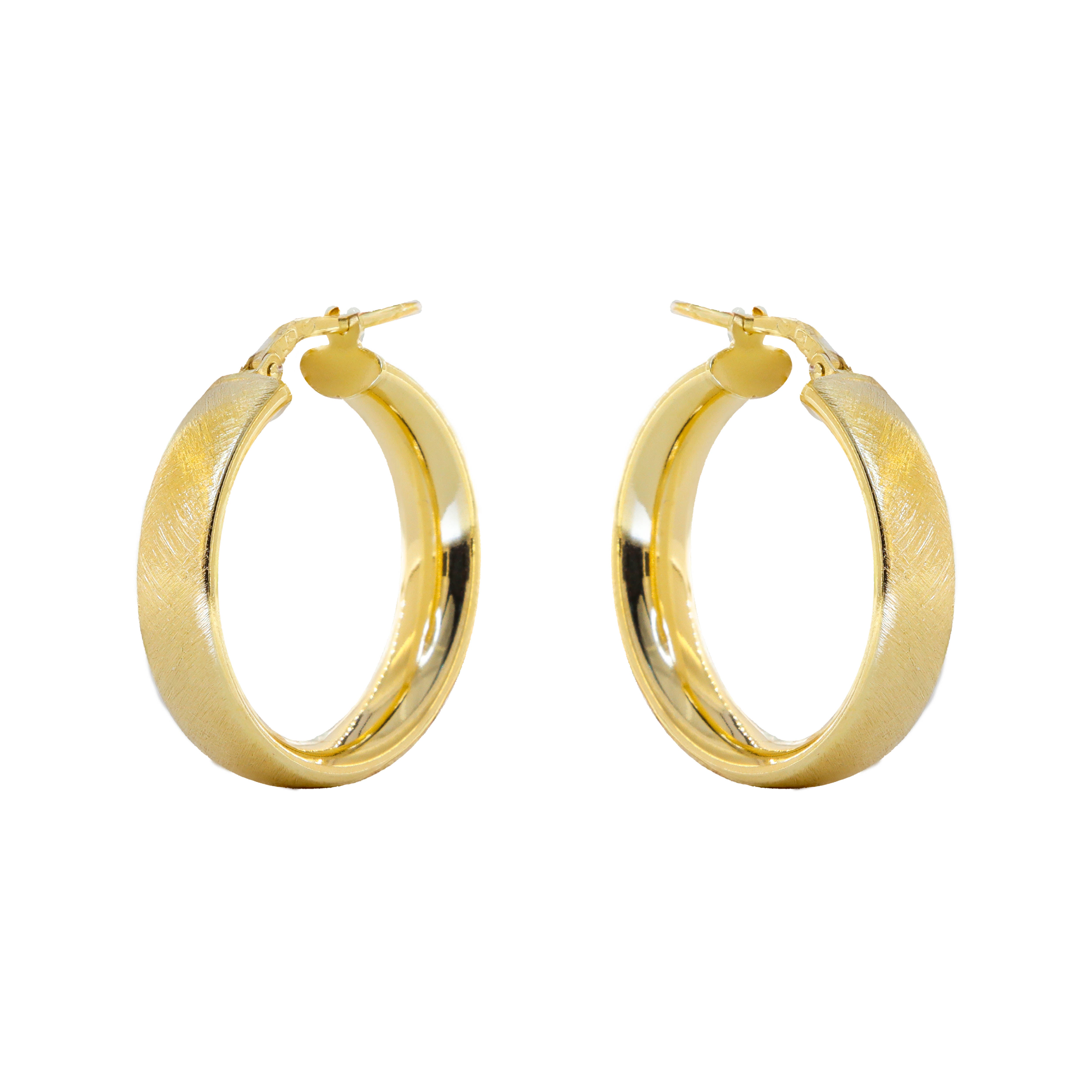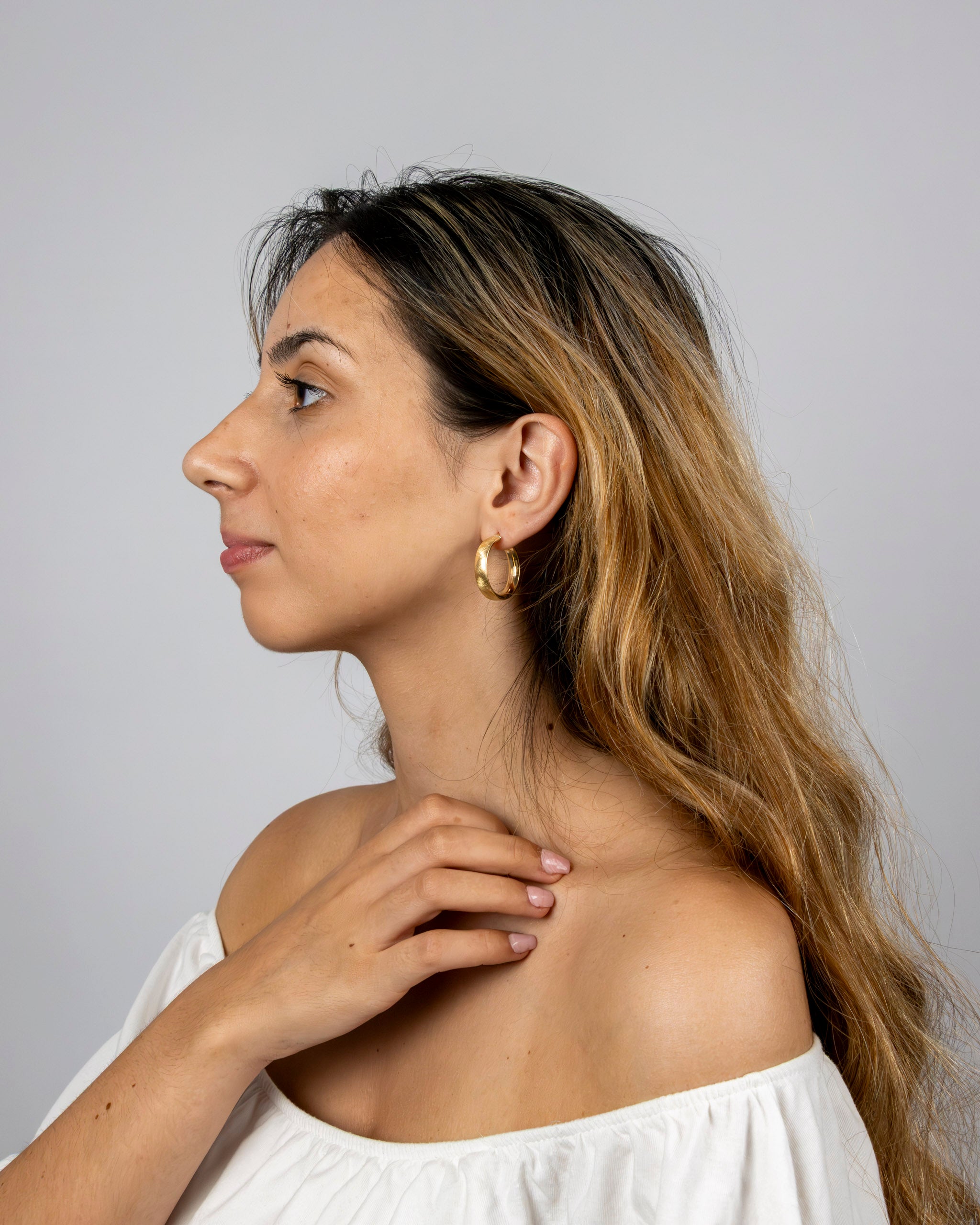 Destaca-te com os Brincos Freya, onde argolas volumosas exibem uma textura escovada que contrasta com o interior polido espelhado. Esta peça sofisticada joga com acabamentos opostos numa dança visual fascinante, criando um acessório que equilibra rusticidade contemporânea com elegância refinada numa linguagem dourada única