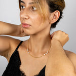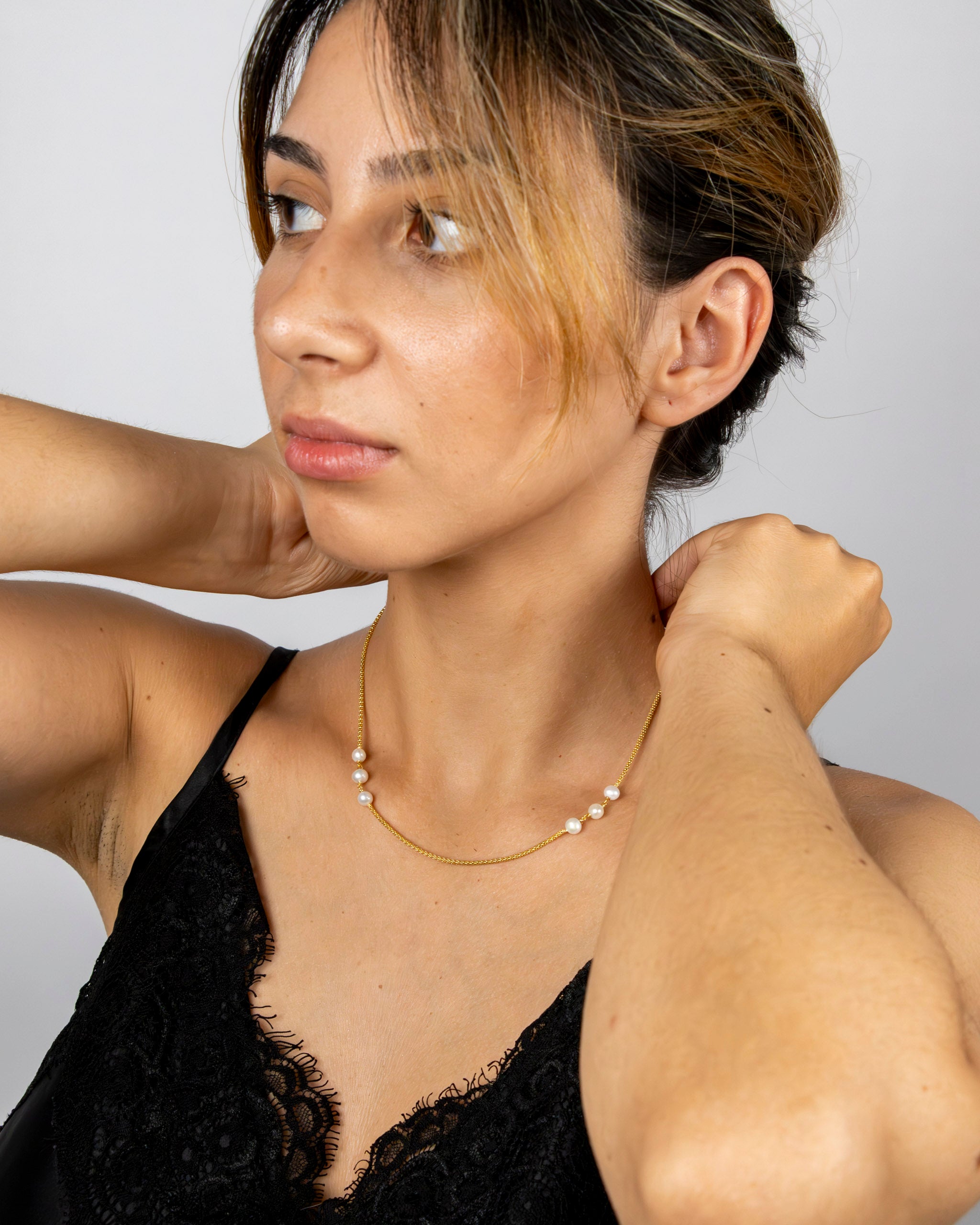 Abraça a magia celestial com o Colar Stella, uma criação que reúne trios de pérolas luminosas como pequenas galáxias pessoais.
