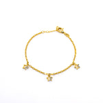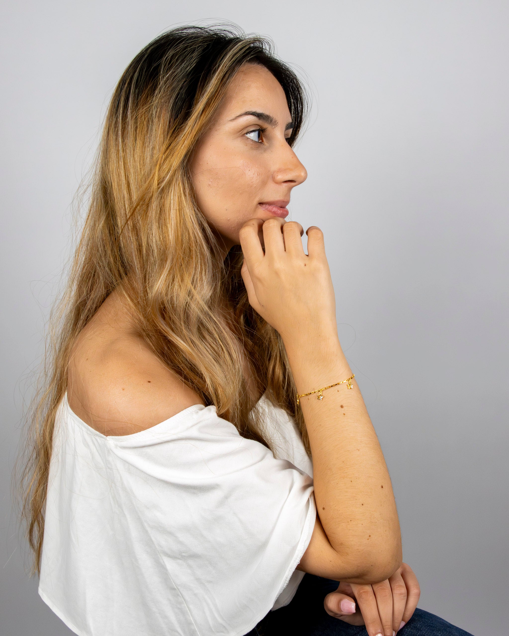 Envolve-te no luxo celestial da Pulseira Andrómeda, onde três estrelas douradas cravejadas de cristais criam uma sinfonia de brilhos numa corrente refinada. Esta peça deslumbrante eleva o conceito estelar a um novo patamar de elegância, transformando o teu pulso numa verdadeira galáxia pessoal repleta de luz e sofisticação