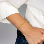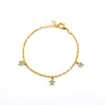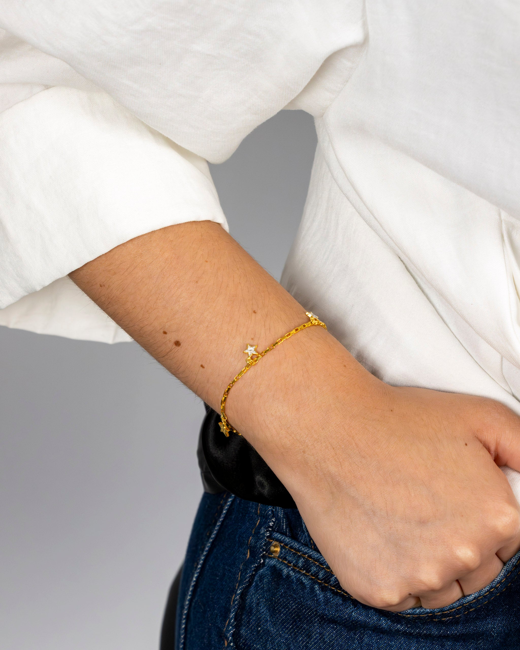 Envolve-te no luxo celestial da Pulseira Astreia, onde três estrelas douradas intensamente cravejadas de cristais criam uma sinfonia de brilhos numa corrente refinada. Esta peça deslumbrante eleva o conceito estelar a um novo patamar de elegância, transformando o teu pulso numa constelação pessoal repleta de luz e sofisticação