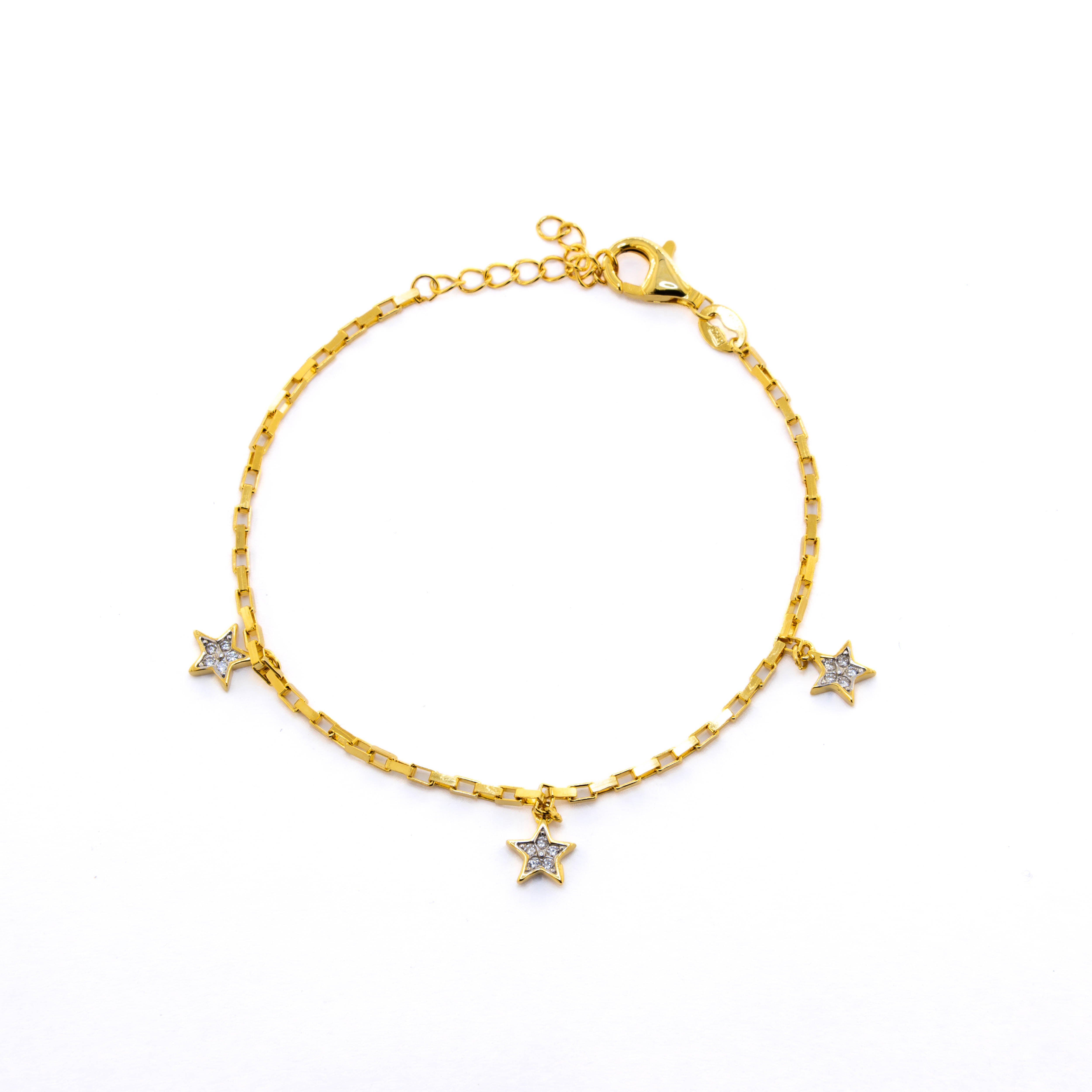 Envolve-te no luxo celestial da Pulseira Astreia, onde três estrelas douradas intensamente cravejadas de cristais criam uma sinfonia de brilhos numa corrente refinada. Esta peça deslumbrante eleva o conceito estelar a um novo patamar de elegância, transformando o teu pulso numa constelação pessoal repleta de luz e sofisticação